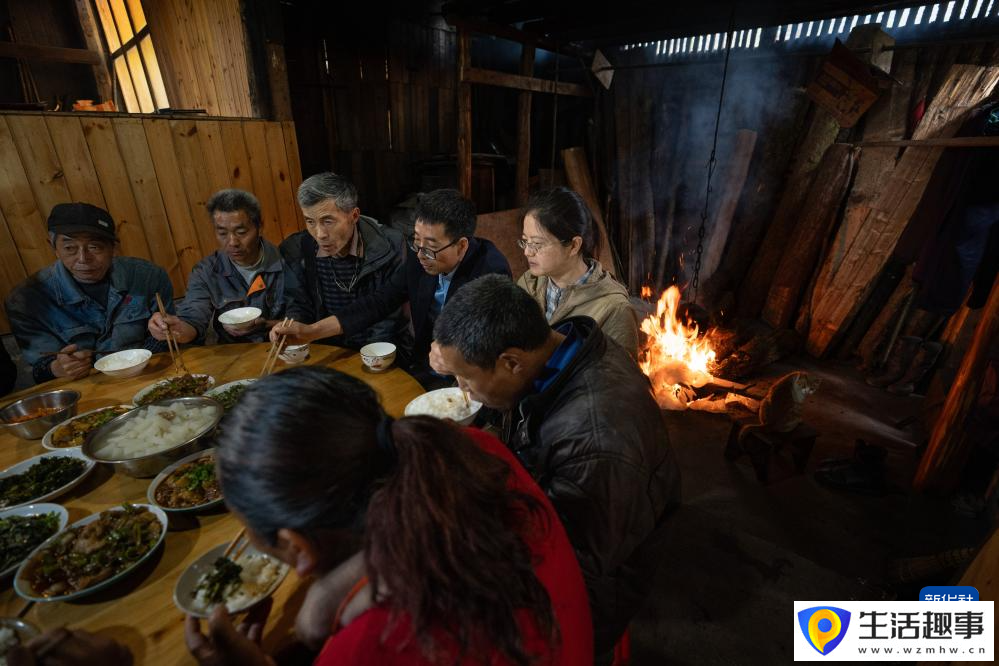 在华西亚高山植物园,庄平、王飞和邵慧敏(左三、左四、左五)和园丁们在工棚里吃午饭(4月17日摄)。新华社记者 江宏景 摄